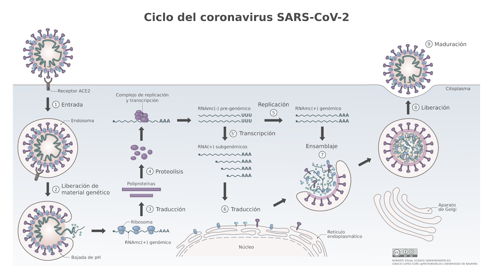 Conocer la biología y el genoma del virus nos facilita diseñar estrategias terapéuticas (antivirales) y preventivas (vacunas). Sabemos que el genoma de SARSCoV2 tiene una similitud del 79% con el de SARS. Uno de los genes más importantes es el que codifica para la glicoproteína S de la superficie del virus, que controla la entrada en la célula. Se sabe que el receptor celular es la enzima ACE2 (enzima 2 que convierte la angiotensina, una proteína de la membrana celular que cataliza la conversión de angiotensia I en el nonapéptido angiotensina 1-9 o de angiotensia II en angiotensina 1-7). La llave de entrada del virus a la célula es la proteína S y la cerradura en la célula el receptor ACE2. La proteína S de SARSCoV2 tiene una similitud de un 76% con la de su pariente el SARS, y una mayor afinidad por el receptor ACE2. Esto podría explicar porque el nuevo coronavirus es más contagioso y transmisible que el SARS. La entrada del virus está además facilitada por una proteasa de la propia célula, que se denomina TMPRSS211. Hay otros genes importantes del SARSCoV2 que actúan cuando el virus ya está dentro de la célula. Son el de la ARN polimerasa (RdRp), una enzima que replica el genoma del virus y los de las proteasas C3CLpro y PLpro, que intervienen en el procesamiento de la proteínas virales. Estos genes tiene una similitud con los del SARS de un 95, 95 y 83%, respectivamente.